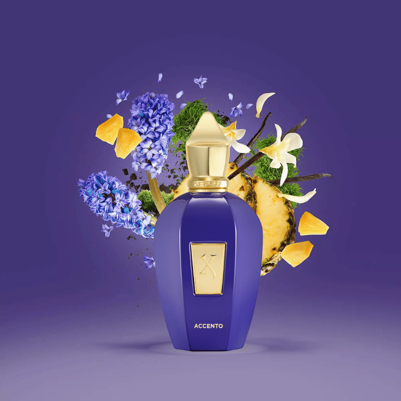 Mở đầu rạng rỡ với quýt vàng, mâm xôi logan và dứa lấp lánh, điểm tô lan dạ hương, tiêu hồng, nhài, diên vỹ thanh tú. Hậu vị là vani, hổ phách, xạ hương, đàn hương và trầm hương quý hiếm nâng Purple Accento lên đỉnh cao nghệ thuật – xa hoa, tinh xảo, khó có thể vươn tới.